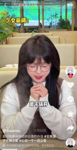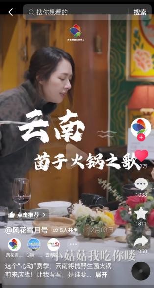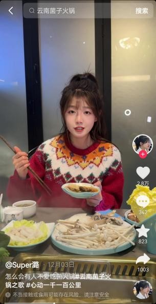 通过纵向深挖本地日常优势品类,抖音生活服务更进一步帮助城市打造了当地特色爆款,催生文旅消费新热点。围绕节目中三组嘉宾赞不绝口的云南菌子火锅,抖音生活服务联手云南本地文旅部门,借势抖音站内热歌改编推出“云南菌子火锅之歌”,并联动抖音站内达人接力二创,通过魔性bgm花式推广菌子火锅,激起网友对见手青、牛肝菌等美味菌菇的好奇和尝试欲望,从而让菌子不再只是“云南传说”,而成了更多人切实的消费选择。