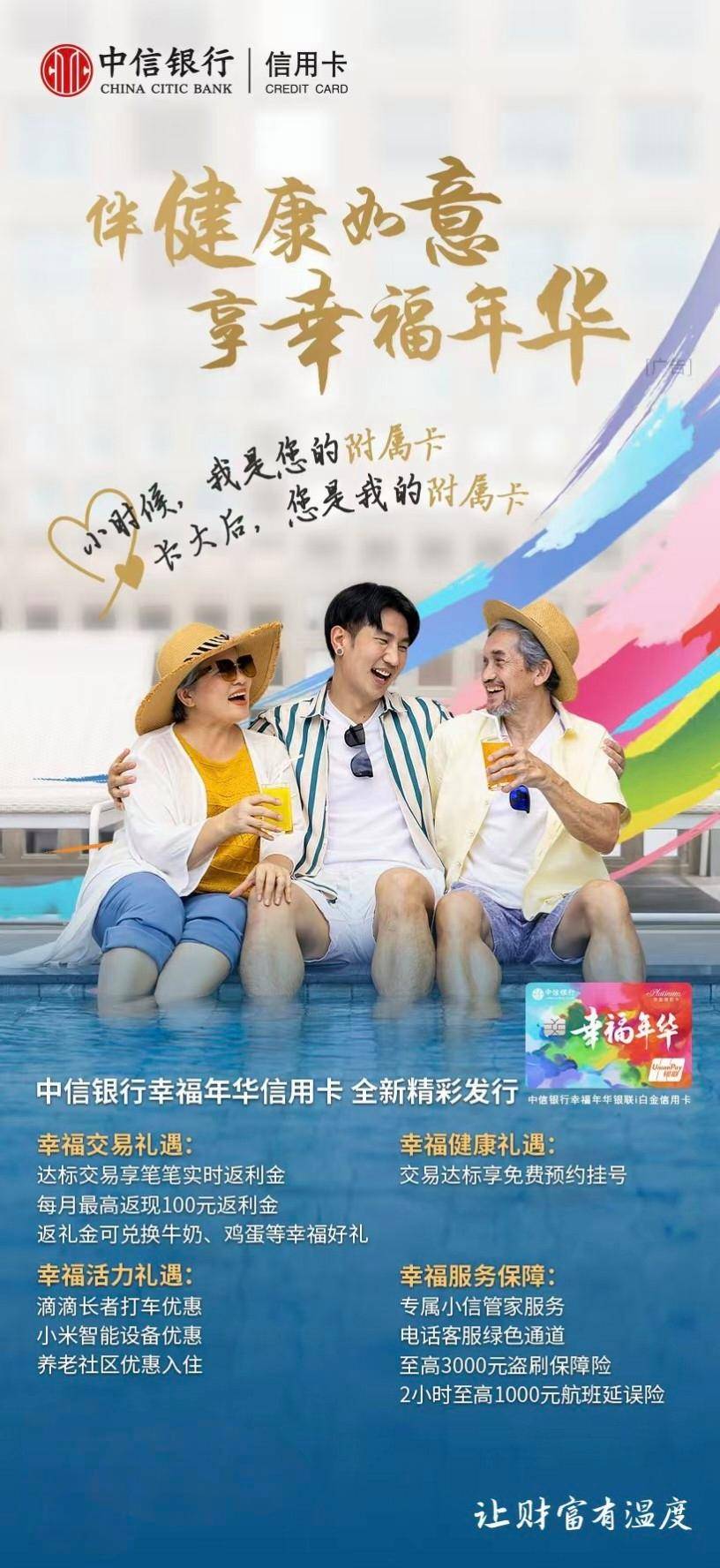 本次全新推出的中信银行幸福年华信用卡,洞悉中老年客群多层次、多样化、个性化的服务需求特点,符合条件的任意中信银行信用卡主卡持卡人均可为父母长辈申请附属卡。同时,提供金卡、i白金卡、精英白金卡、尊贵白金卡不同等级选择,并在消费生活、健康关怀、安全保障、交通出行等方面匹配系列特色权益。