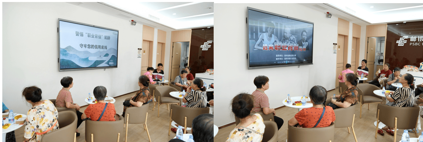 光明港支行以本次金融教育宣传周活动为切入点,结合开展了“福韵护财・U心相伴”金融知识宣传站沙龙活动,现场组织了“警惕‘职业背债’陷阱 守牢您的信用底线”专题宣讲活动。工作人员通过PPT课件及视频,向到场客户系统讲解了“职业背债”陷阱的真面目、揭秘“职业背债”套路、掉进陷阱的严重后果、如何防范“职业背债”陷阱等,结合近期发生的真实案例,生动形象地展示了“职业背债”给受害者带来的严重经济损失和信用损害。到场的客户积极参与互动讨论,就日常生活中遇到的金融疑问进行咨询,工作人员一一给予专业解答。