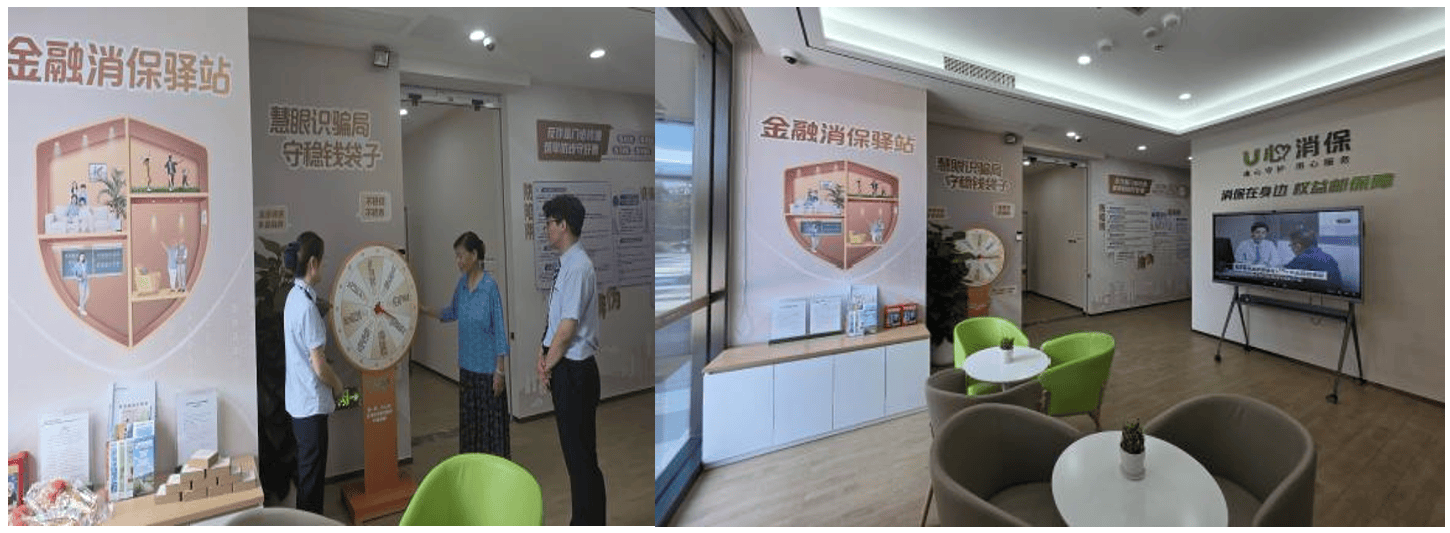 在支行消保宣传专区的“金融消保驿站”,设置了反诈指南、知识沙龙及互动游戏三个板块,普及为民办实事举措及金融知识,提升公众风险防范与理性投资能力。客户通过“慧眼识骗局 守稳钱袋子”问答转盘,正确回答转盘上的金融知识问答题,即可获得精美小礼品一份。现场客户积极参与,在寓教于乐的轻松氛围中将金融知识进行普及,潜移默化地提升了公众风险防范与理性投资能力。