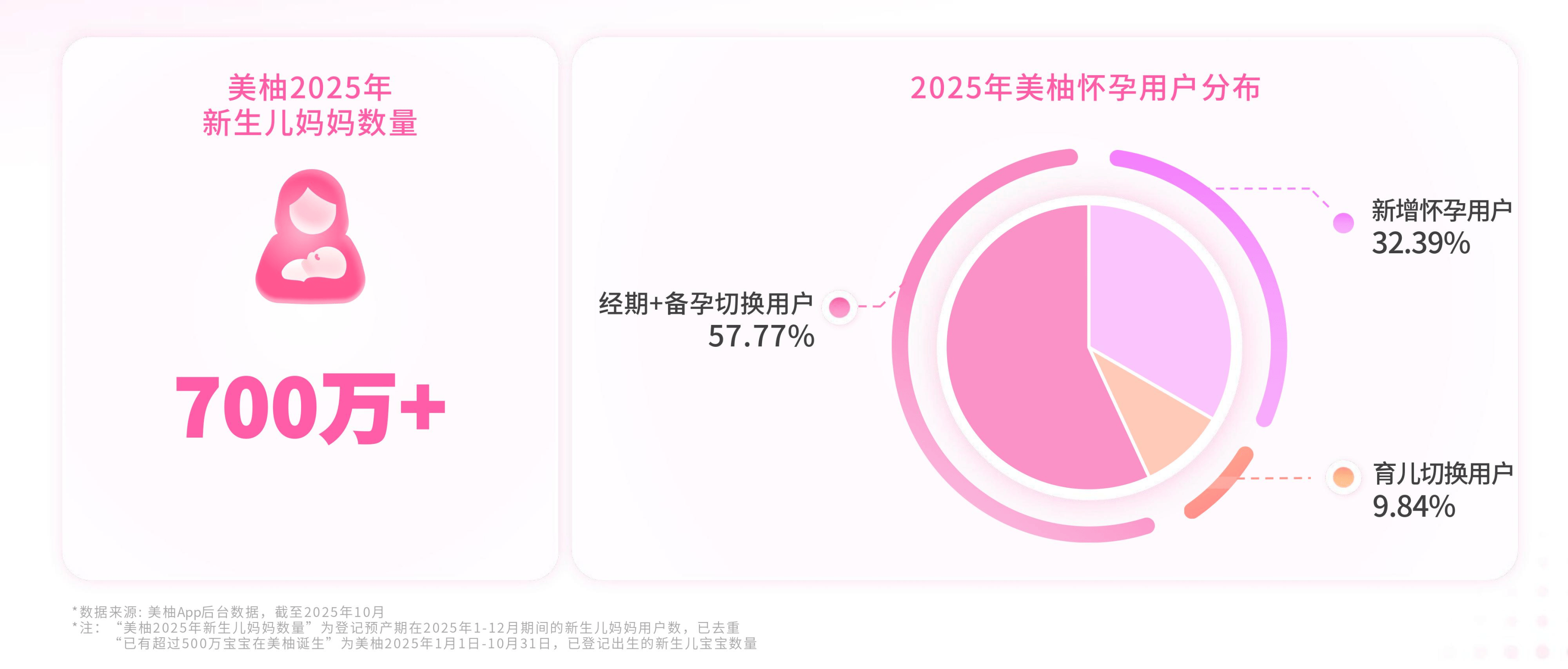 美柚平台数据显示,其孕育用户增速强劲,经期用户成为稳定的孕育储备军。2025年超700万填写预产期的用户中,由原有孕前(经期+备孕)和育儿用户转化而来的占比总计超六成,凸显了平台覆盖女性全生命周期的服务能力。