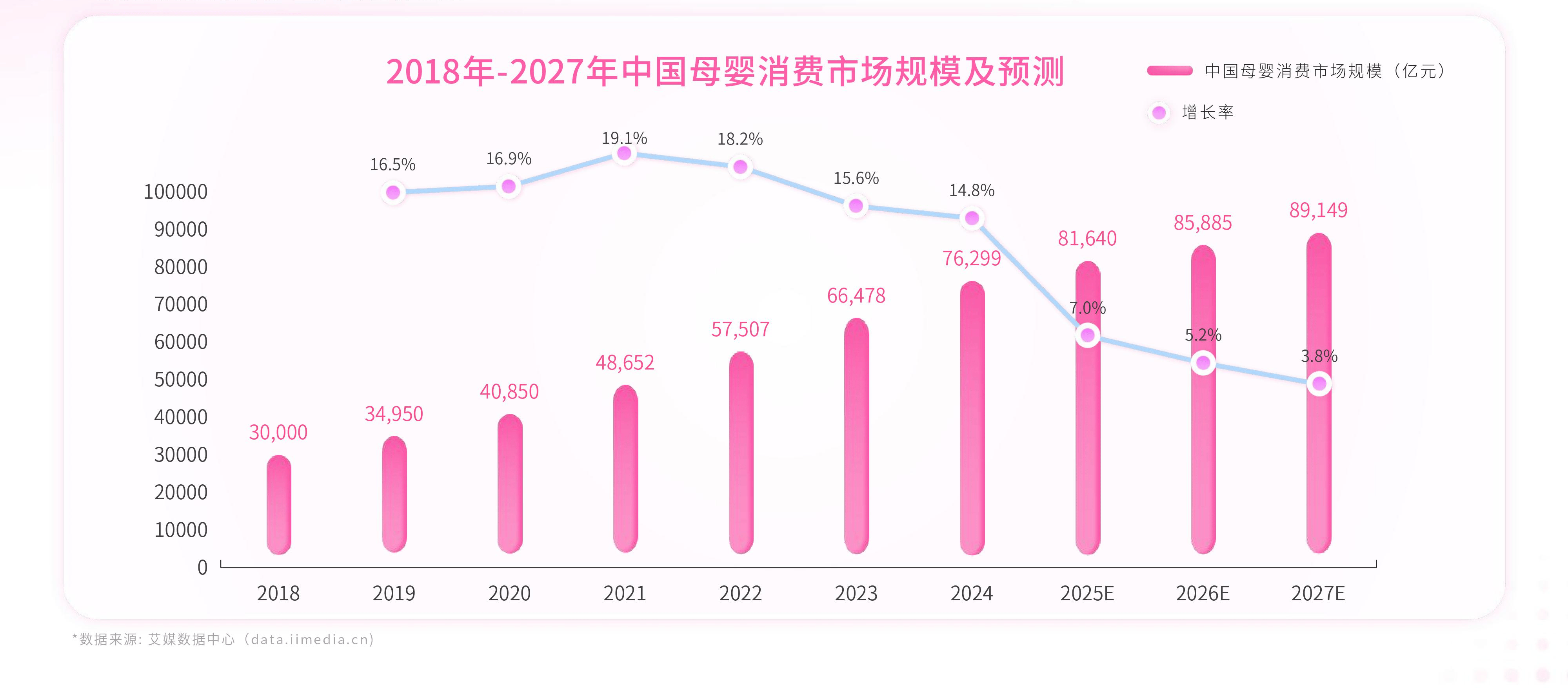 在此背景下,中国母婴消费市场展现出强劲韧性。第三方数据显示,市场规模已从2018年的3万亿元稳步增长至2024年的7.6万亿元,并预计在2027年逼近9万亿元大关。这表明,尽管人口总量承压,但“育儿精细化”与“消费升级”持续推动市场结构性扩容。
