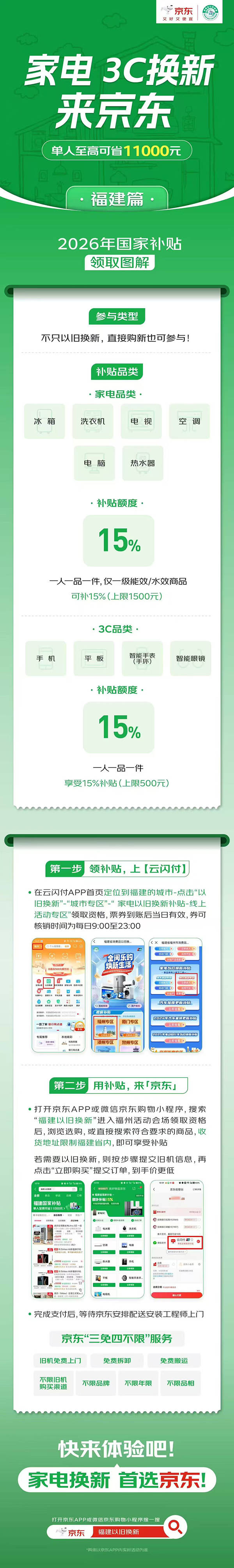 先来看看福建消费者如何领取与使用国补。第一步,在云闪付APP首页定位到福建的城市-点击“以旧换新”- “城市专区”-“家电以旧换新补贴-线上活动专区”领取资格,仅当日有效,可核销时间为每日9:00到23:00。第二步,打开京东APP或微信京东购物小程序,搜索“福建国补”进入活动会场,选择所在城市,浏览选购,或直接搜索符合要求的商品选购,收货地址限福建,即可享受补贴。用户可选择单独购买产品,也可选择使用以旧换新下单,均可享国补。